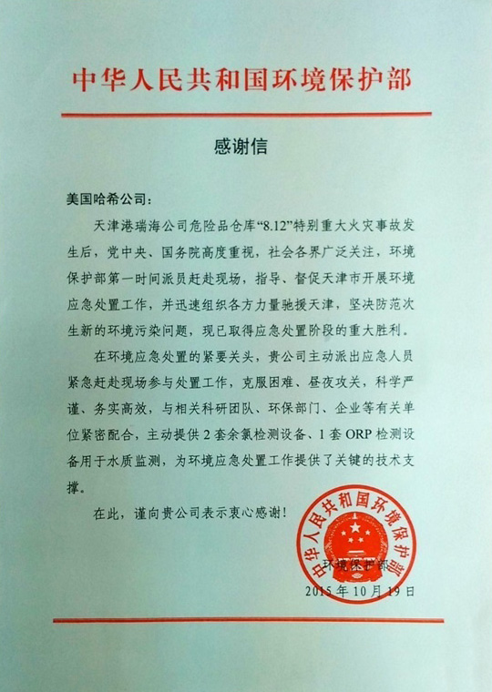 日前哈希收到一封來自中國(guó)環(huán)境保護(hù)部的感謝信,對(duì)于哈希公司在“8.12”天津港爆炸事故應(yīng)急處置的緊要關(guān)頭給予的無私援助與大力支持表示感謝。這讓我們既榮幸,也為自己的工作能給天津港的群眾帶去幫助感到欣慰。